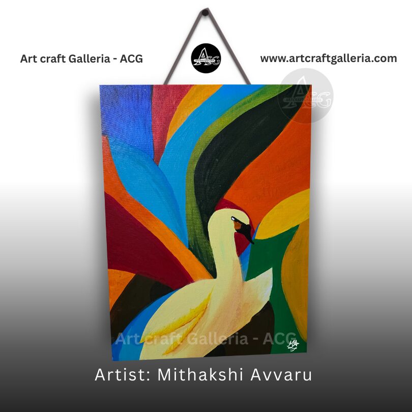 A vibrant abstract painting features a stylized yellow swan set against bold, swirling multicolored shapes.